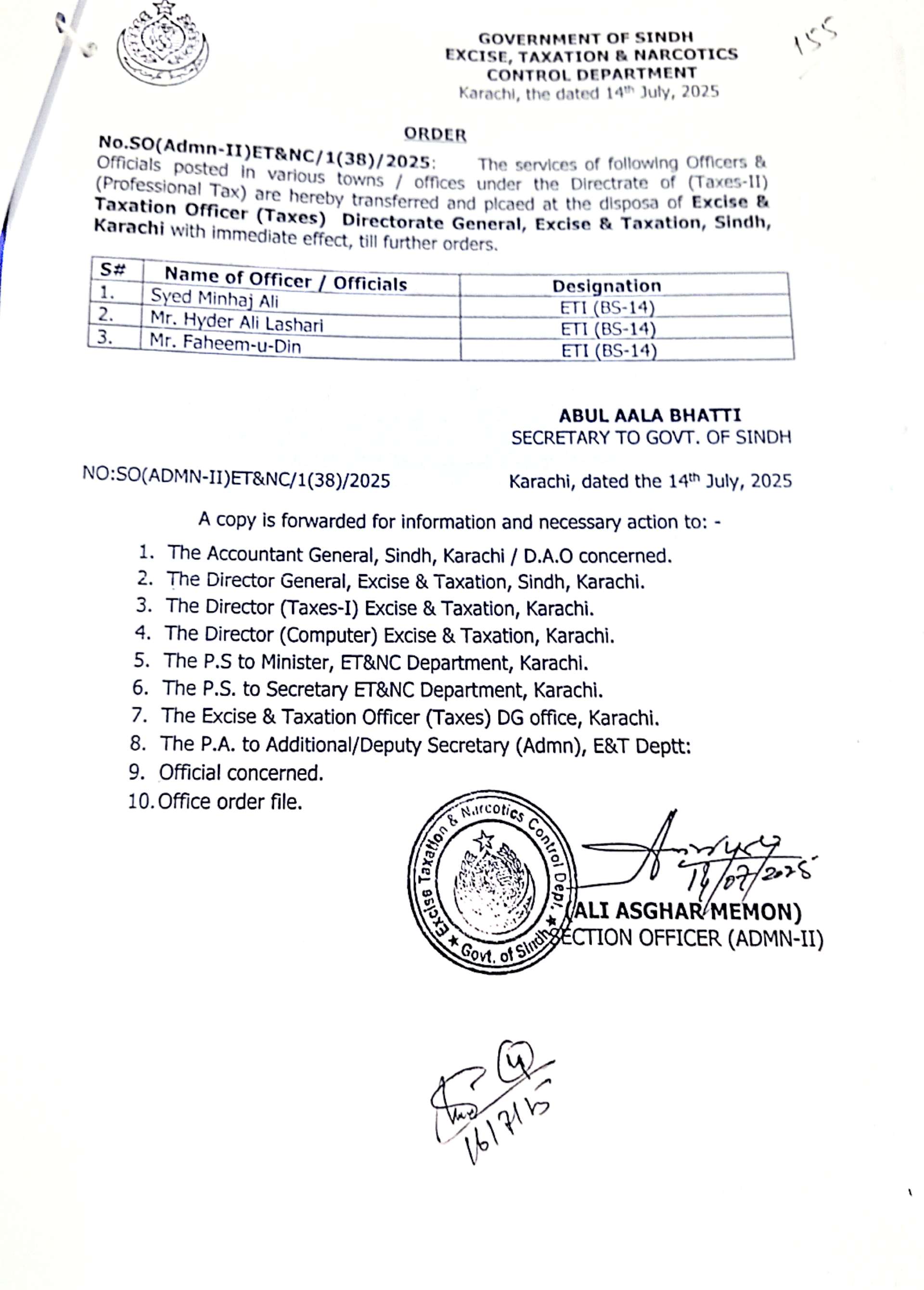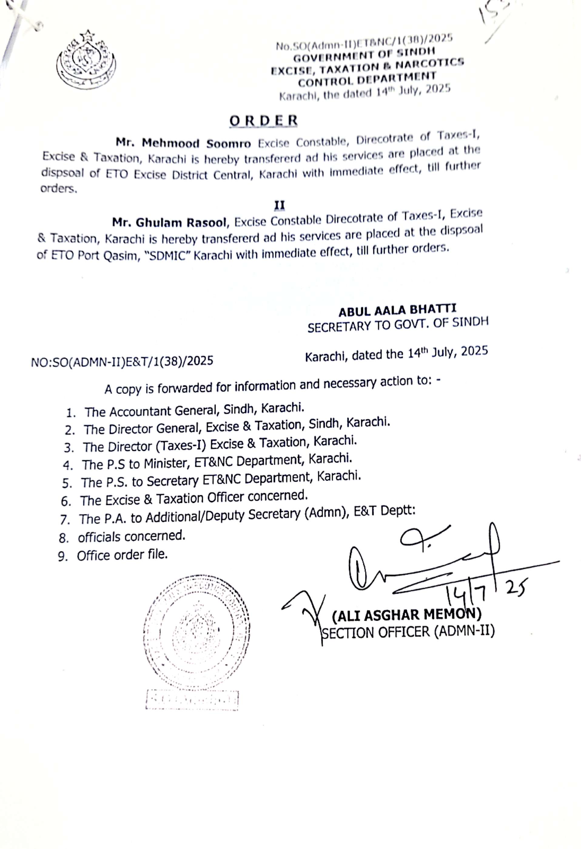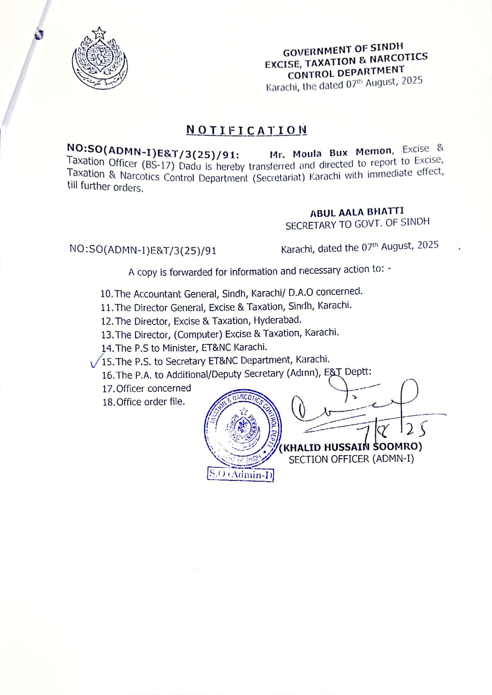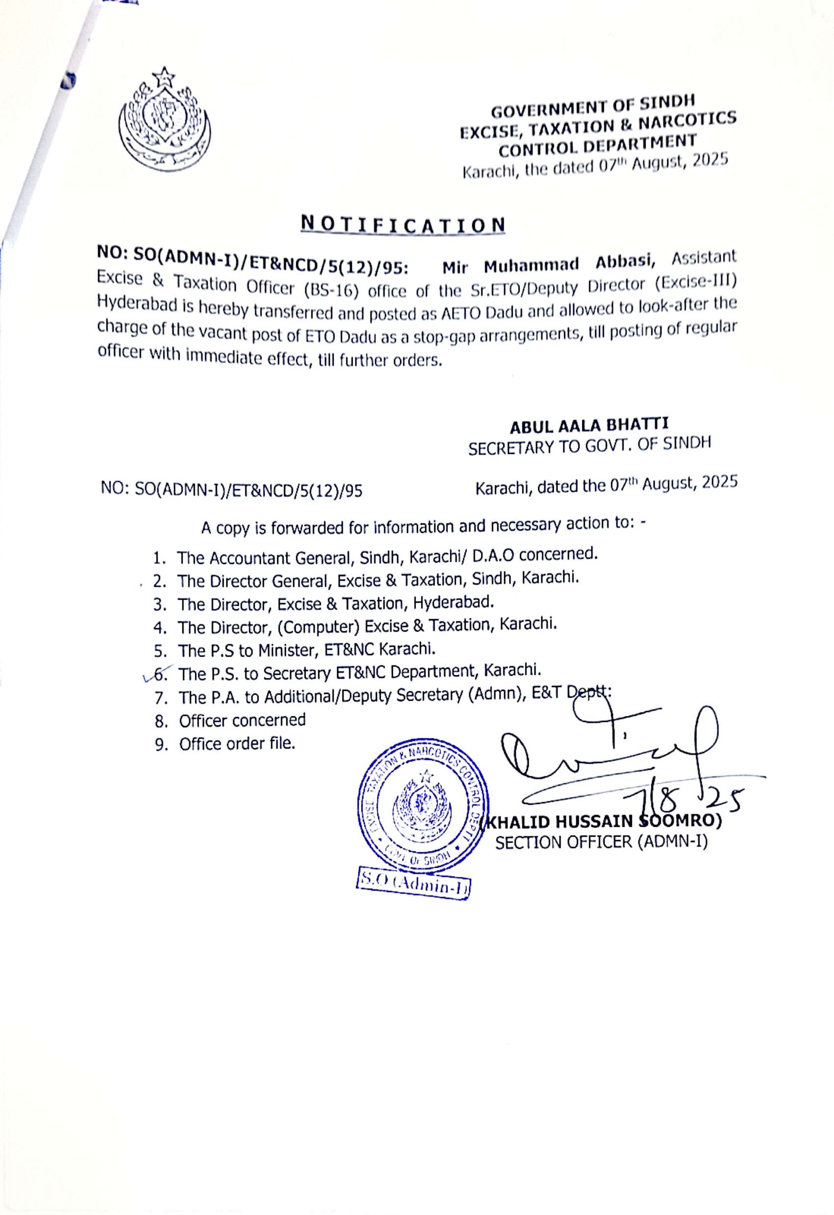 Transfer And Posting Order Of Mir Muhammad Abbasi, Aeto