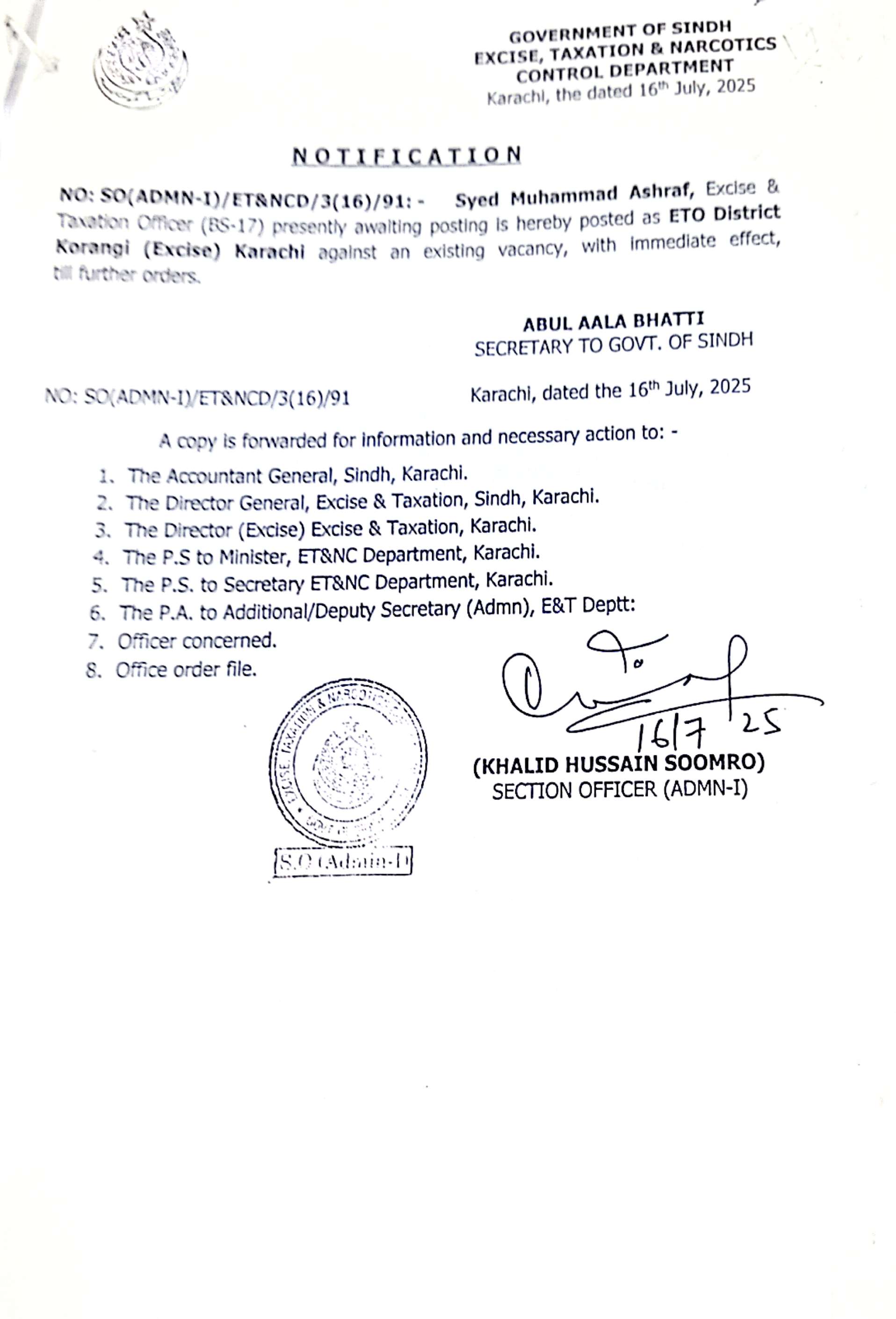 Transfer And Posting Order Of Javed Rasheed Aeto