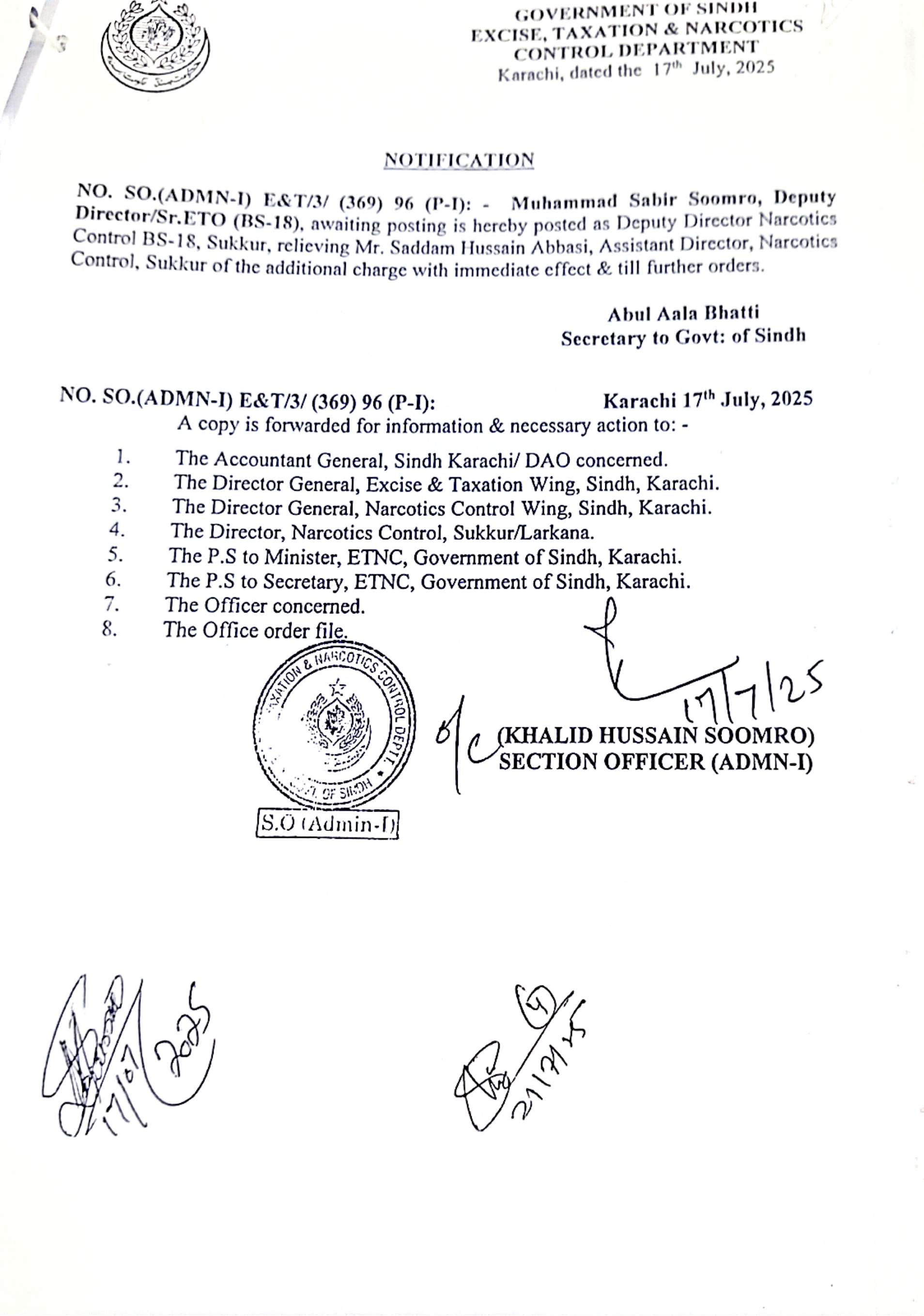 Posting Order Of Muhammad Sabir Soomro, Dd