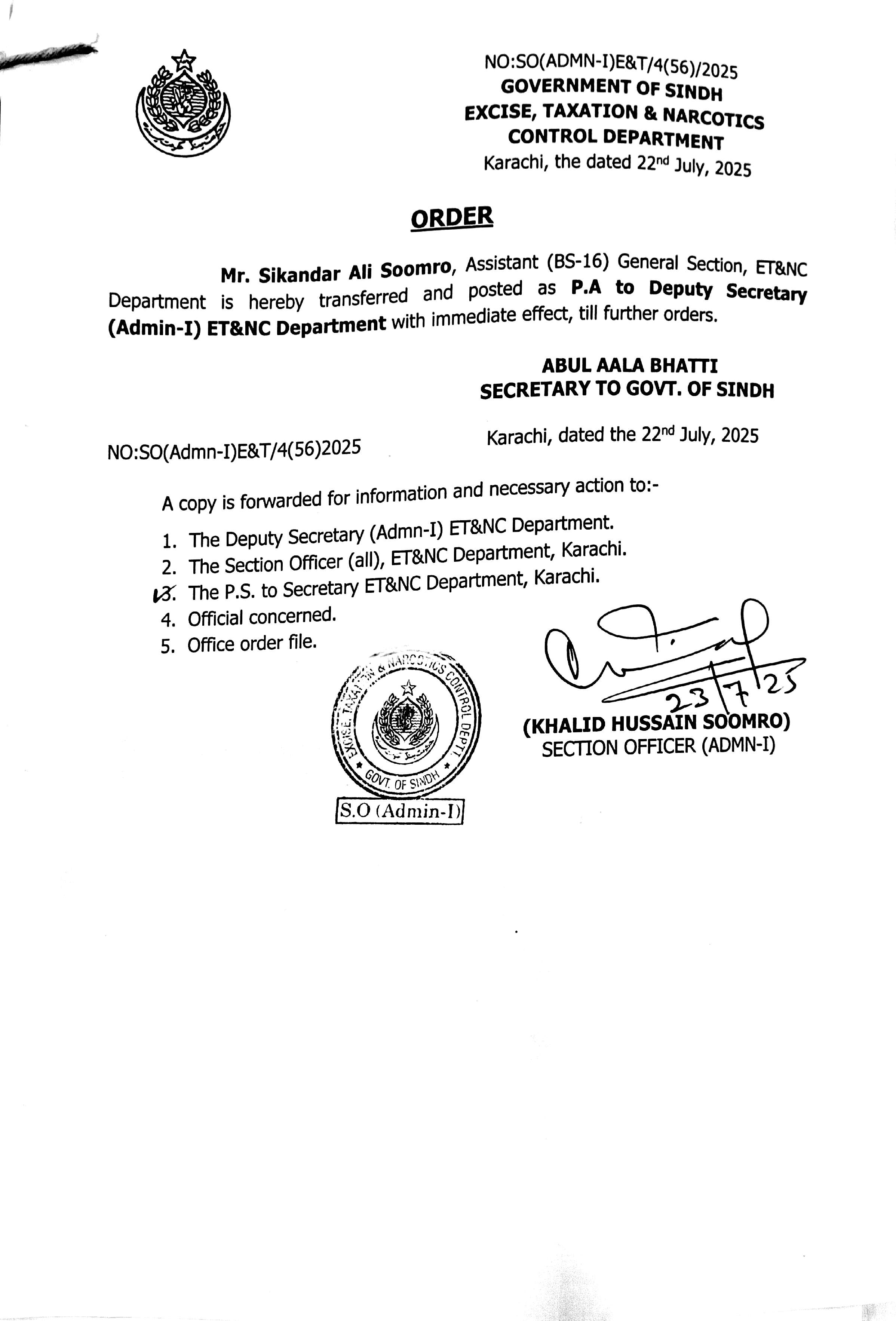 The Directorate Of Taxes-ii (professional Tax) Has Transferred Four Officers And Officials To The Excise & Taxation Officer (sdmic) "airport" Karachi With Immediate Effect, Until Further Orders. The Transferred Personnel Include Two Aetos And Two Etis.