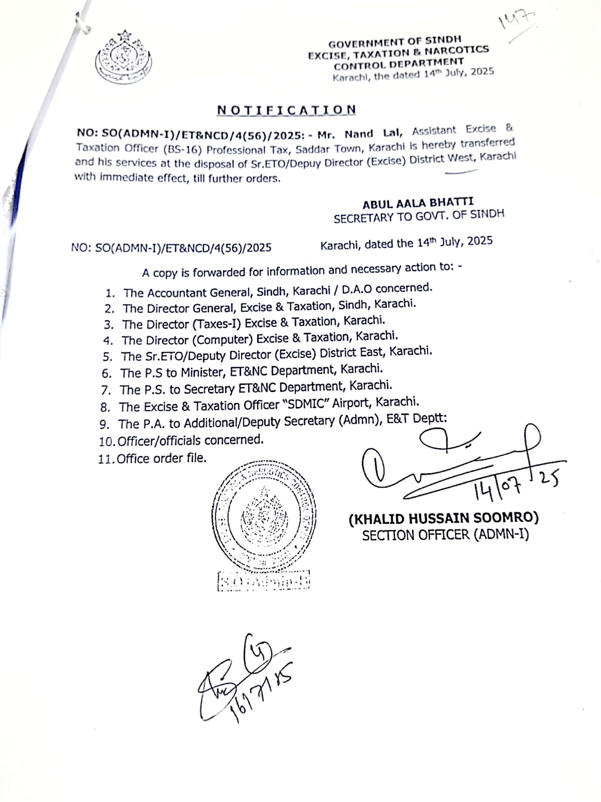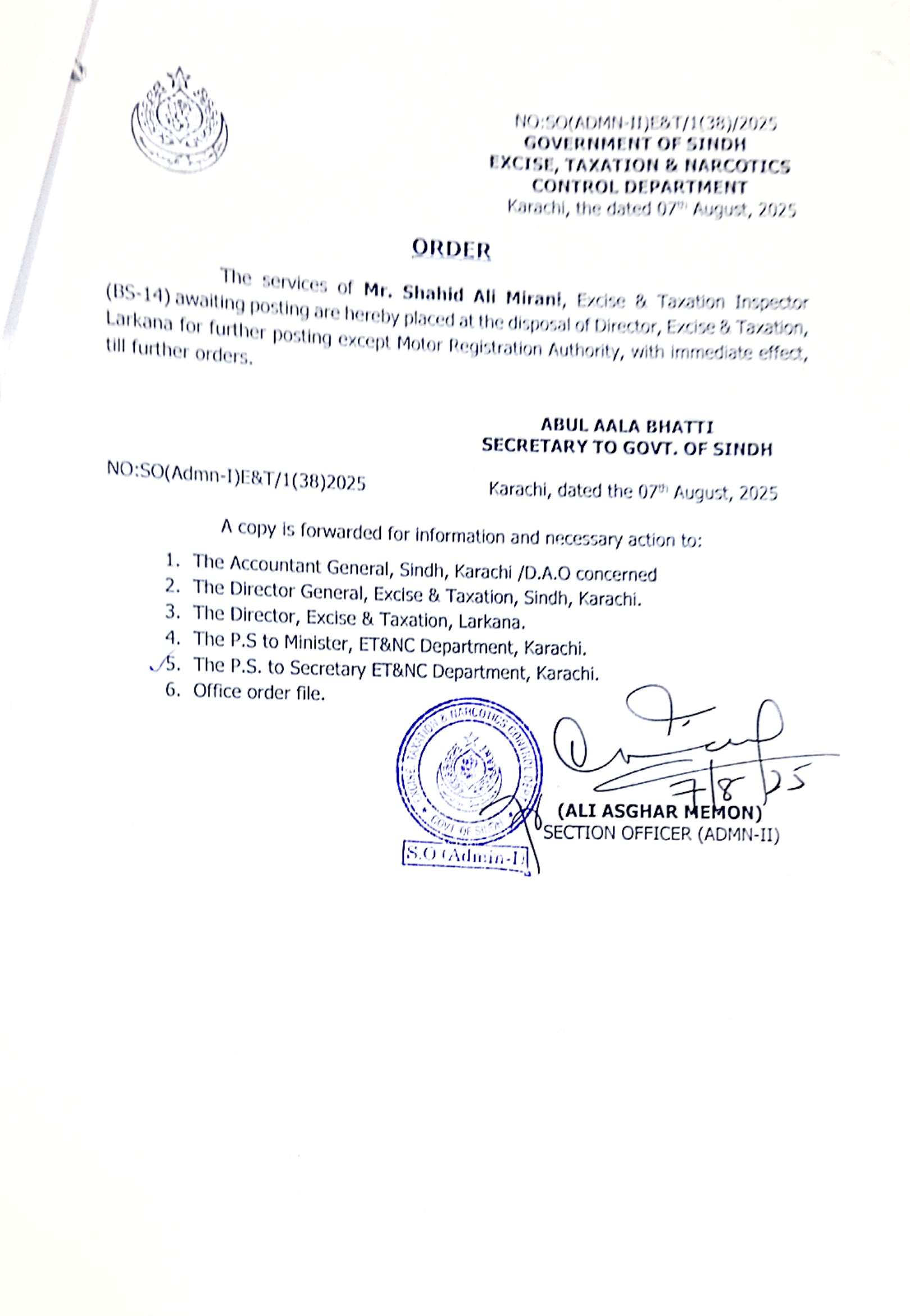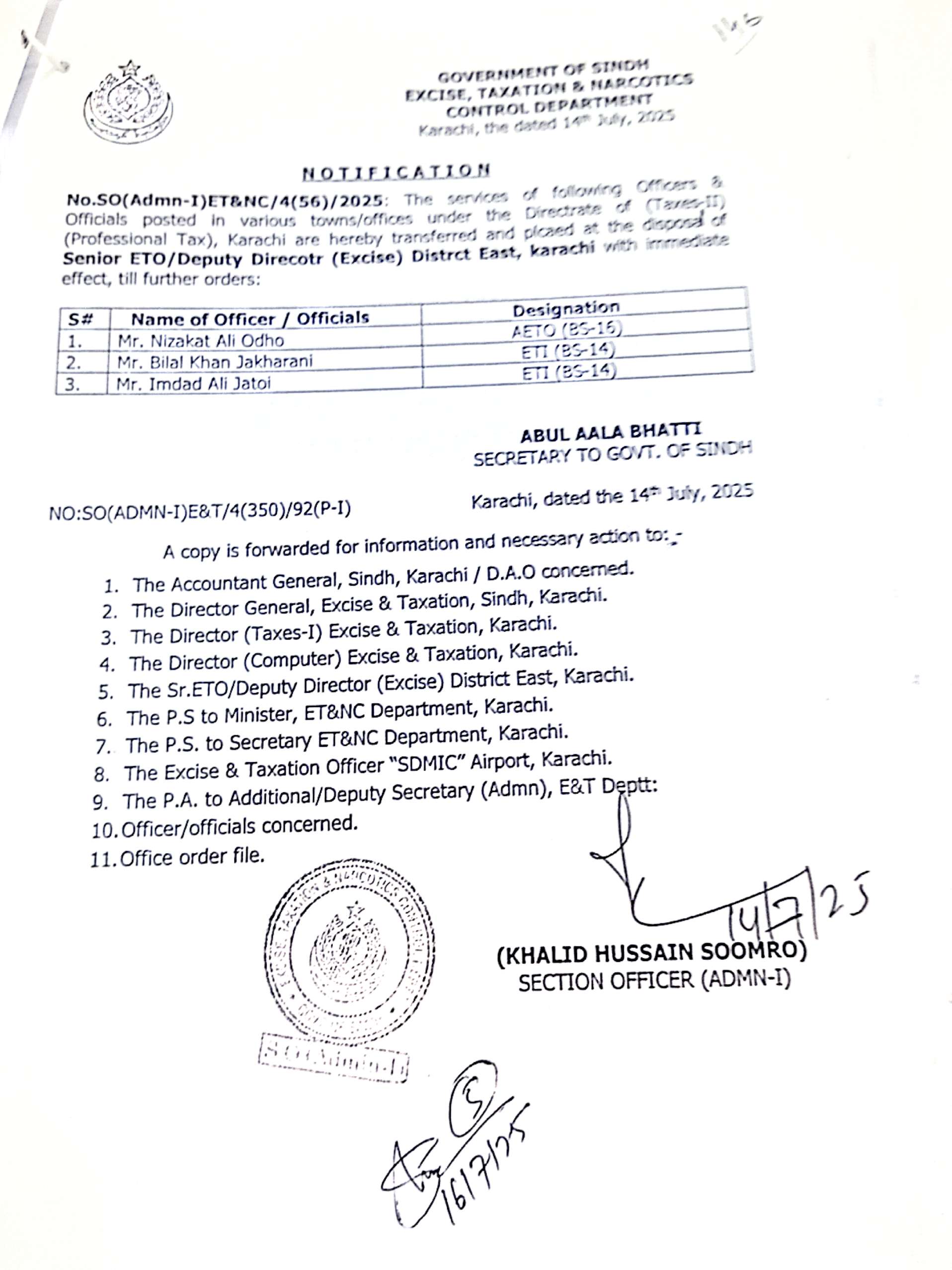 Posting Order Of Naeem Ahmed Soomro, Aeto