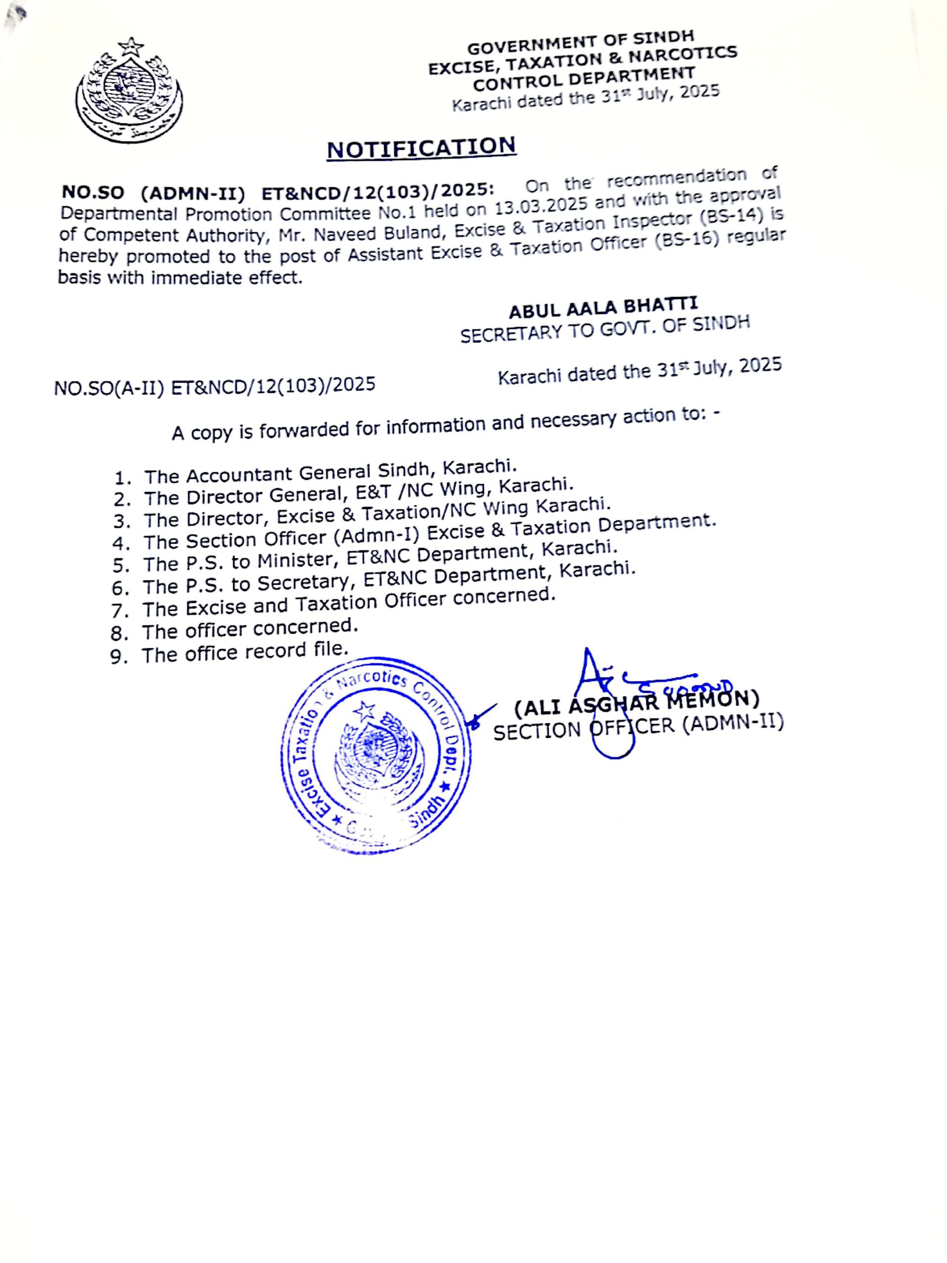 Promotion Order Of Syed Ghulam Murtaza Shah, Eti
