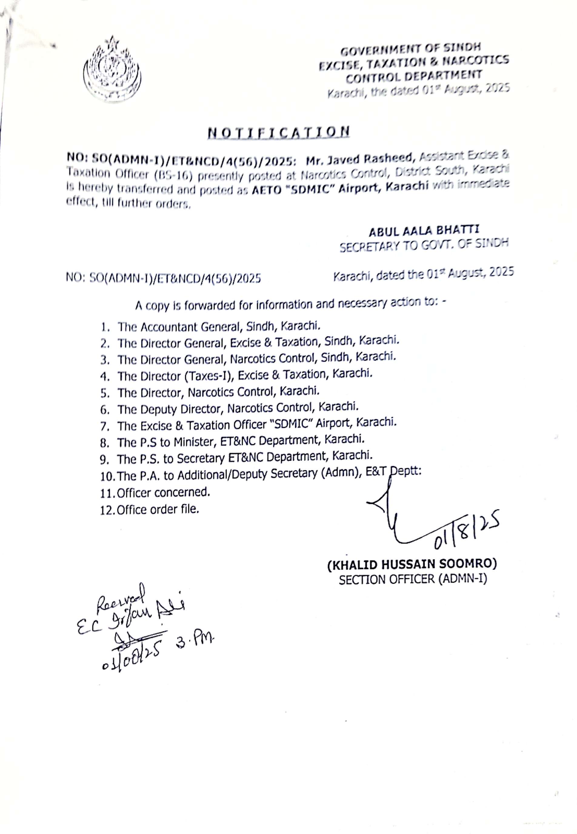 Transfer And Posting Order Of Javed Rasheed Aeto