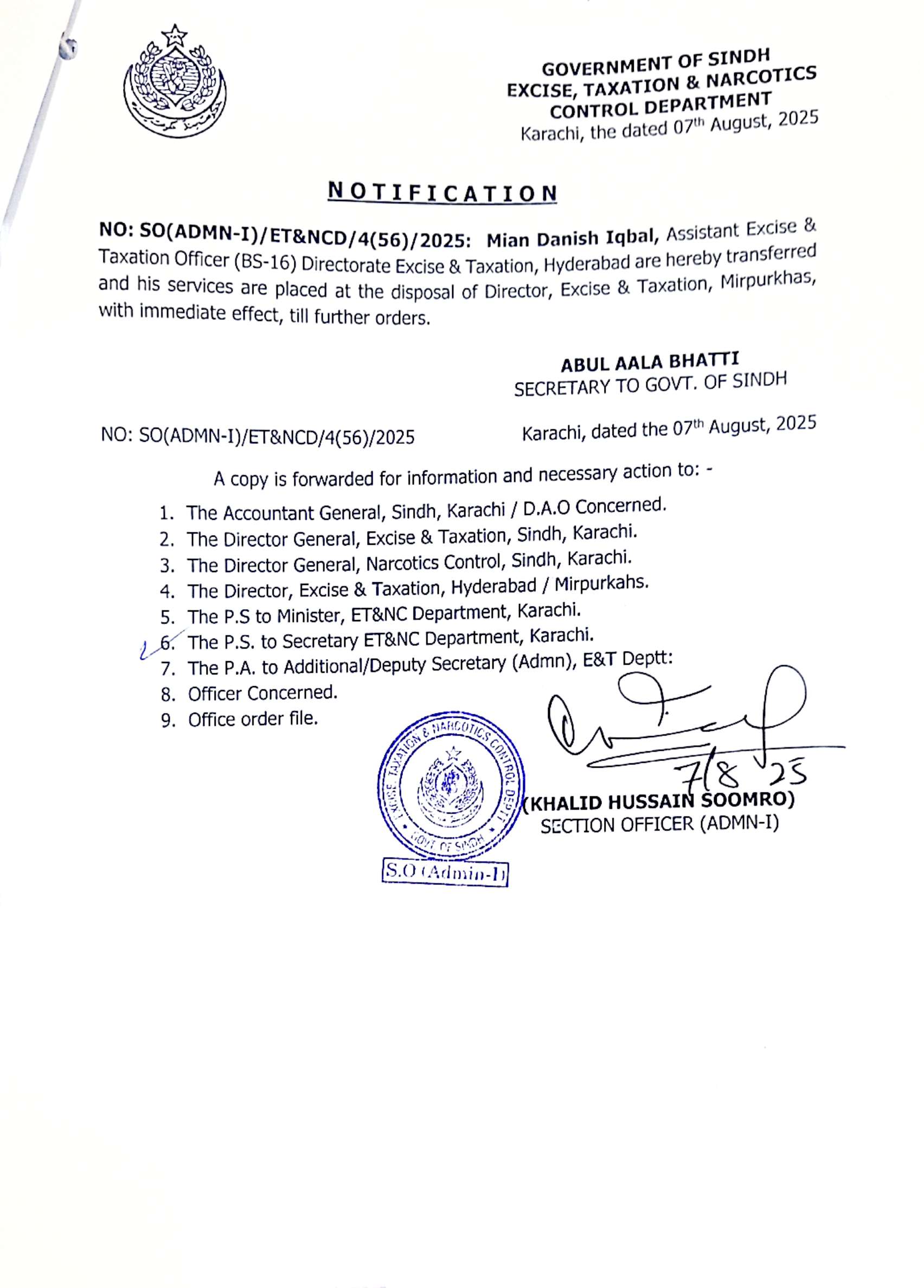 Transfer And Posting Order Of Mian Danish Iqbal Aeto