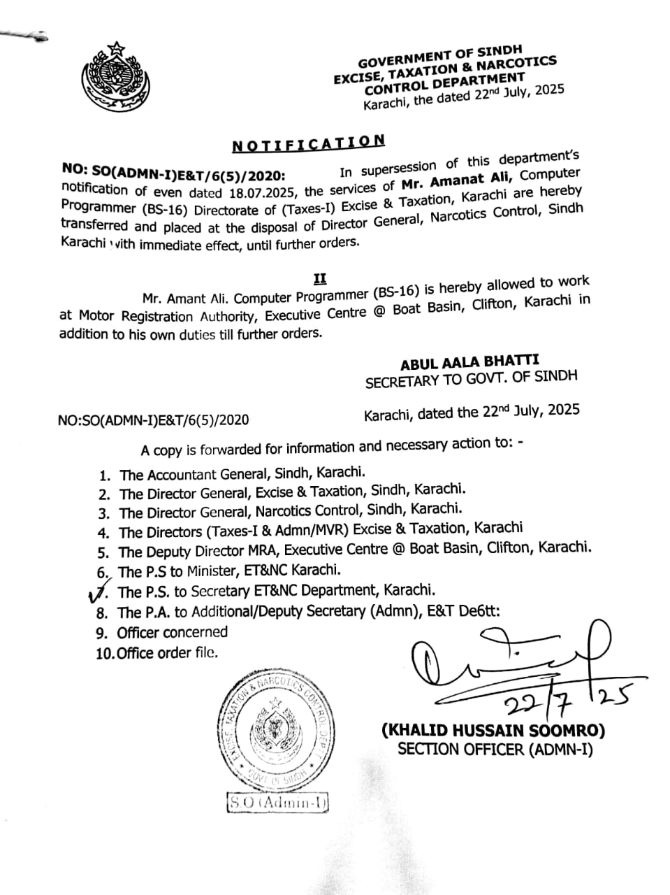 The Directorate Of Taxes-ii (professional Tax) Has Transferred Four Officers And Officials To The Excise & Taxation Officer (sdmic) "airport" Karachi With Immediate Effect, Until Further Orders. The Transferred Personnel Include Two Aetos And Two Etis.