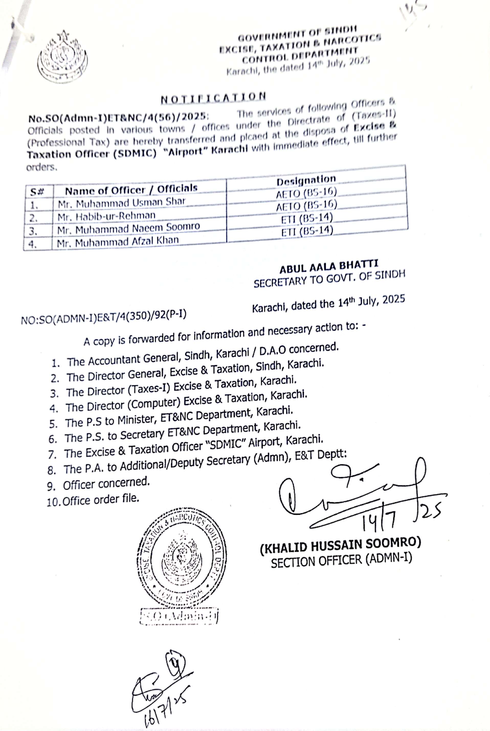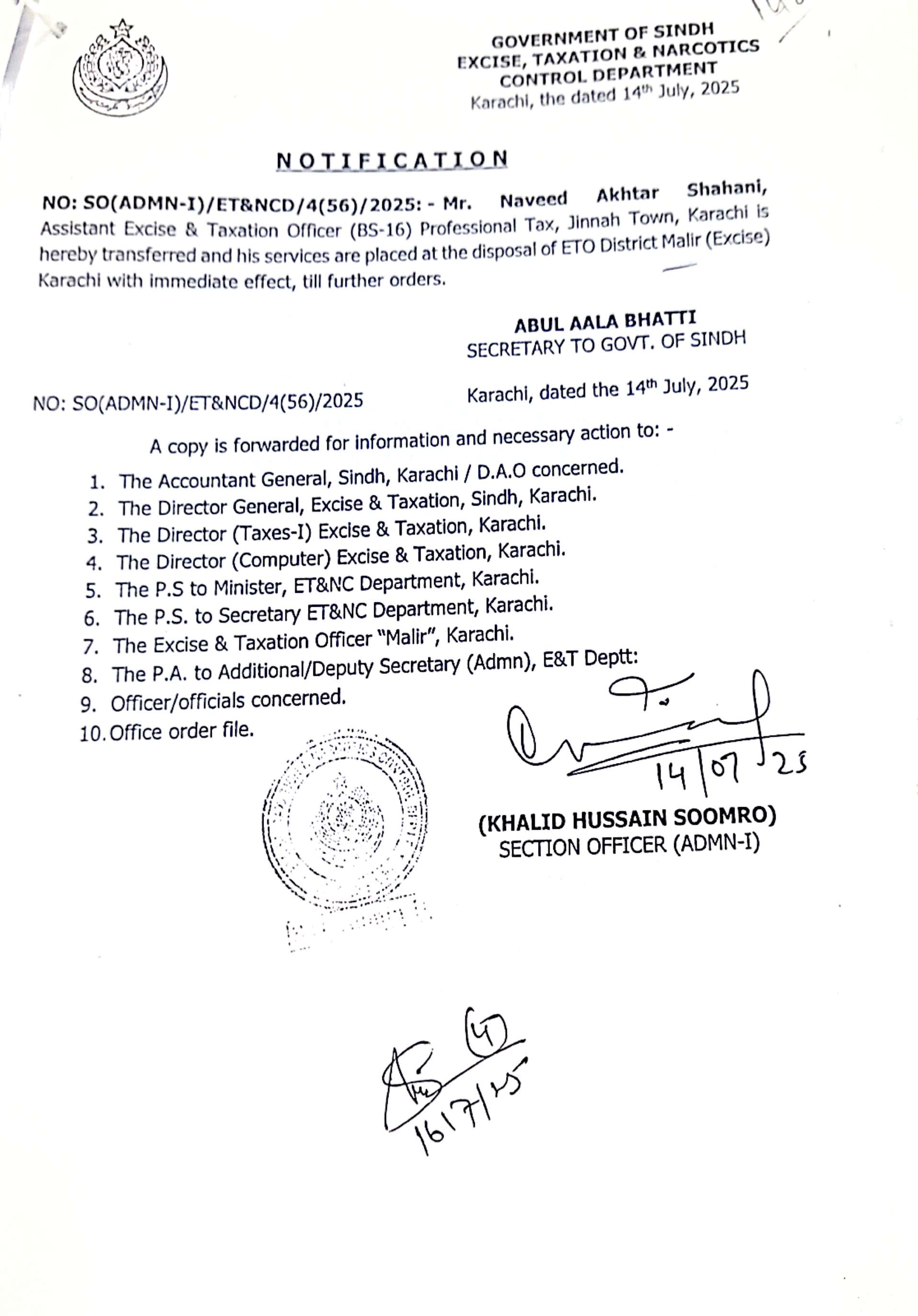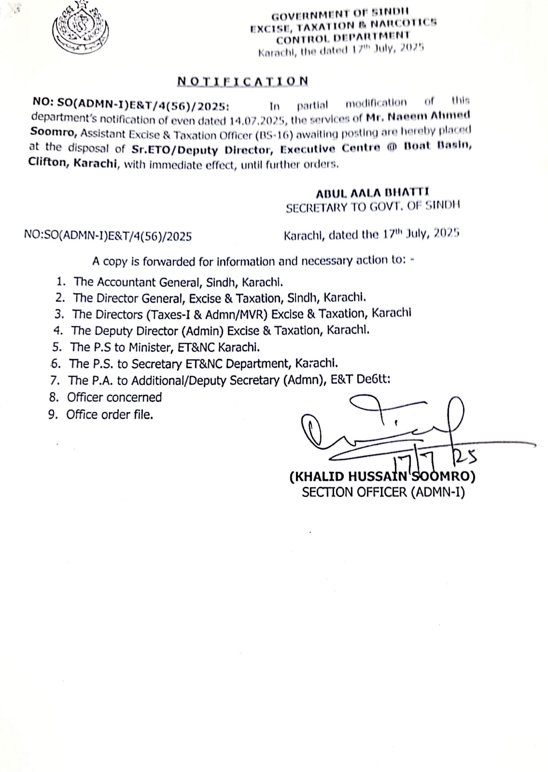 Posting Order Of Naeem Ahmed Soomro, Aeto