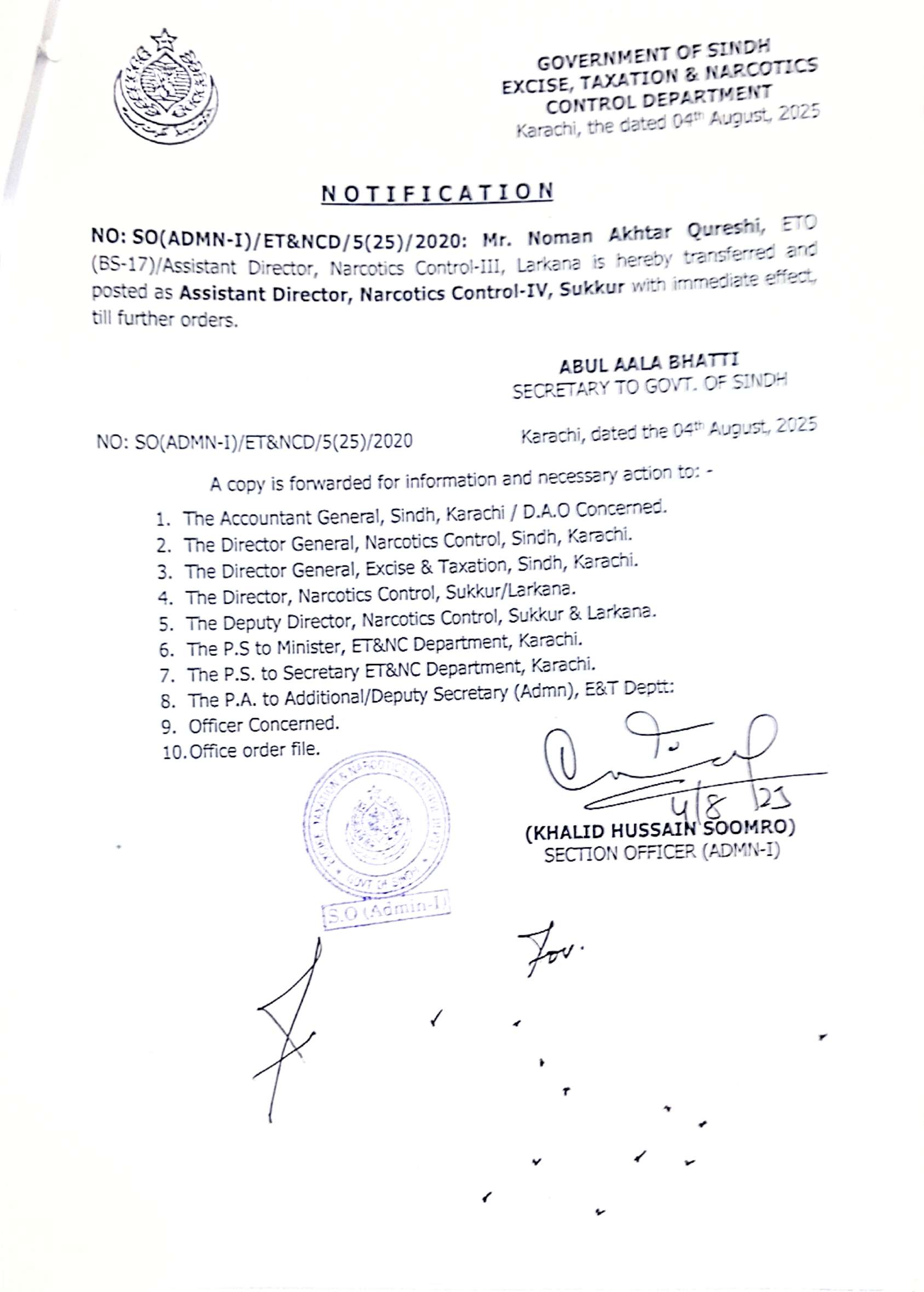 Transfer Order Of Noman Akhtar Qureshi, Eto
