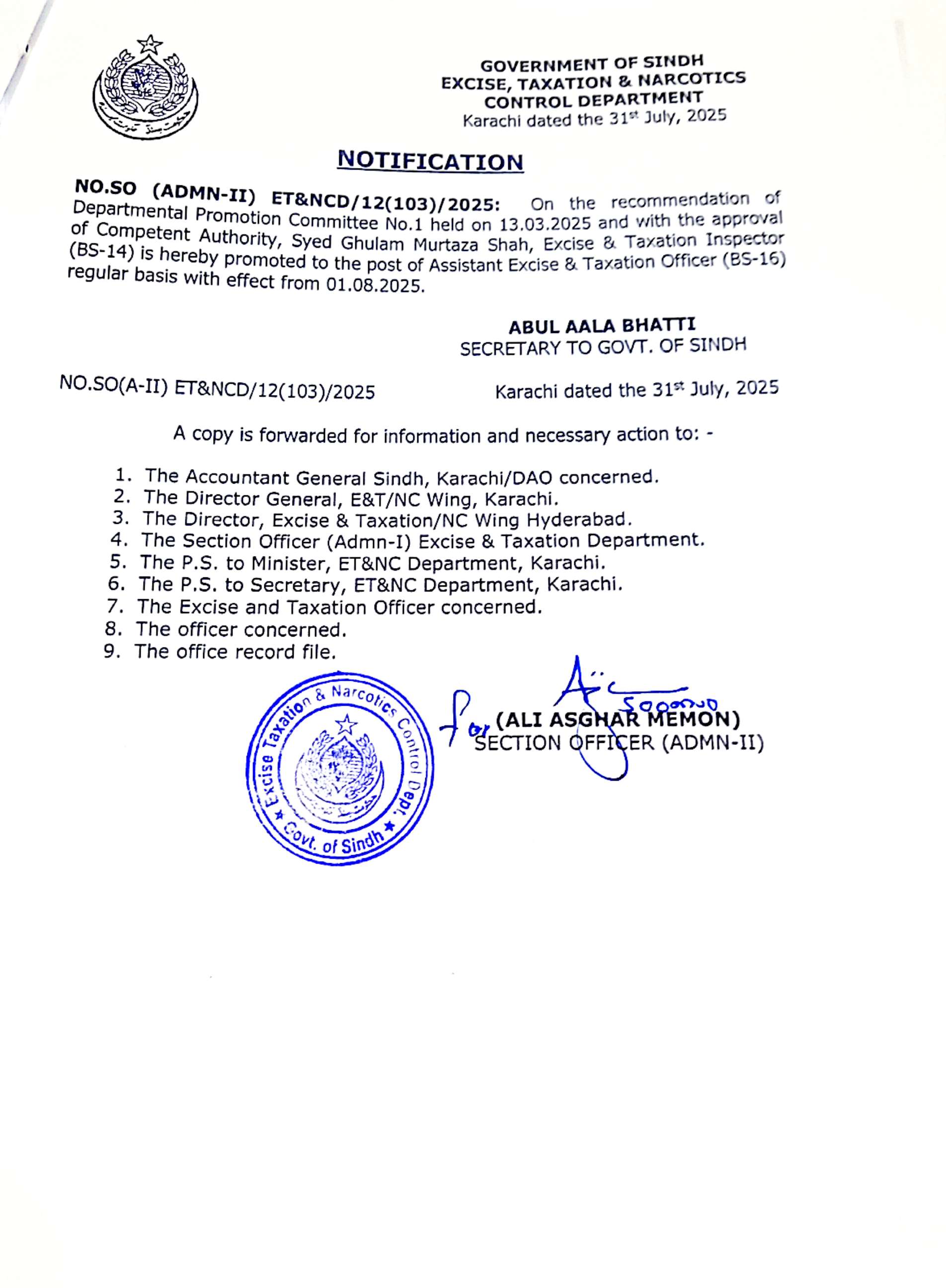 Promotion Order Of Syed Ghulam Murtaza Shah, Eti