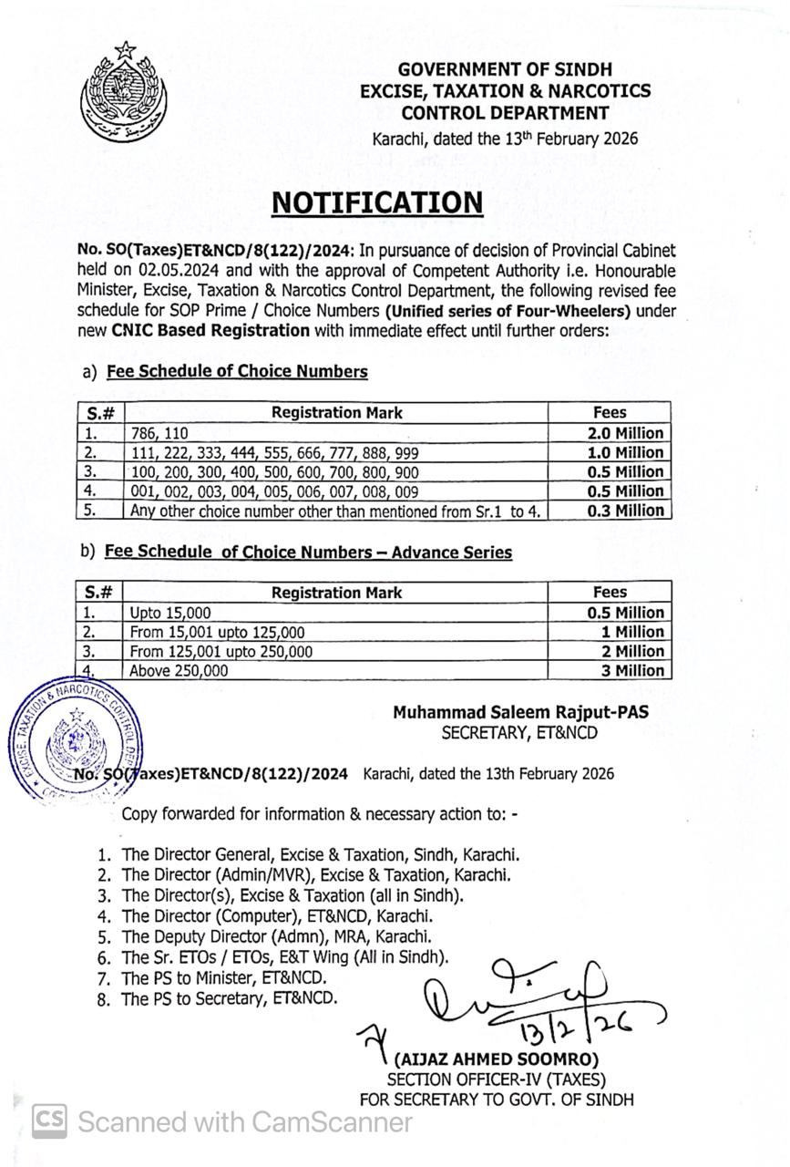 This Official Letter, Issued By The Government Of Sindh's Excise, Taxation & Narcotics Control Department On February 13, 2026, Authorizes The Launch Of Two New Cnic-based Unified Registration Series For Vehicles. Under The Provincial Motor Vehicle (amendment) Act, 2024.